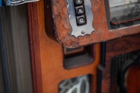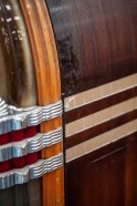 Our skilled restoration team relish a challenge and they were certainly given one here! They were however confident they could bring the dusty woodwork back to life. When cleaned, it became apparent the cabinet had developed a beautiful rich colour during its life, which is common with our old lacquered cabinets and this was something we really wanted to retain and enhance so the jukebox cabinet was able to tell its story. The worst of the cabinet chips were filled and prepared and the cabinet was then sympathetically re-stained and re-lacquered to enhance the beautiful colour and aged character.