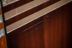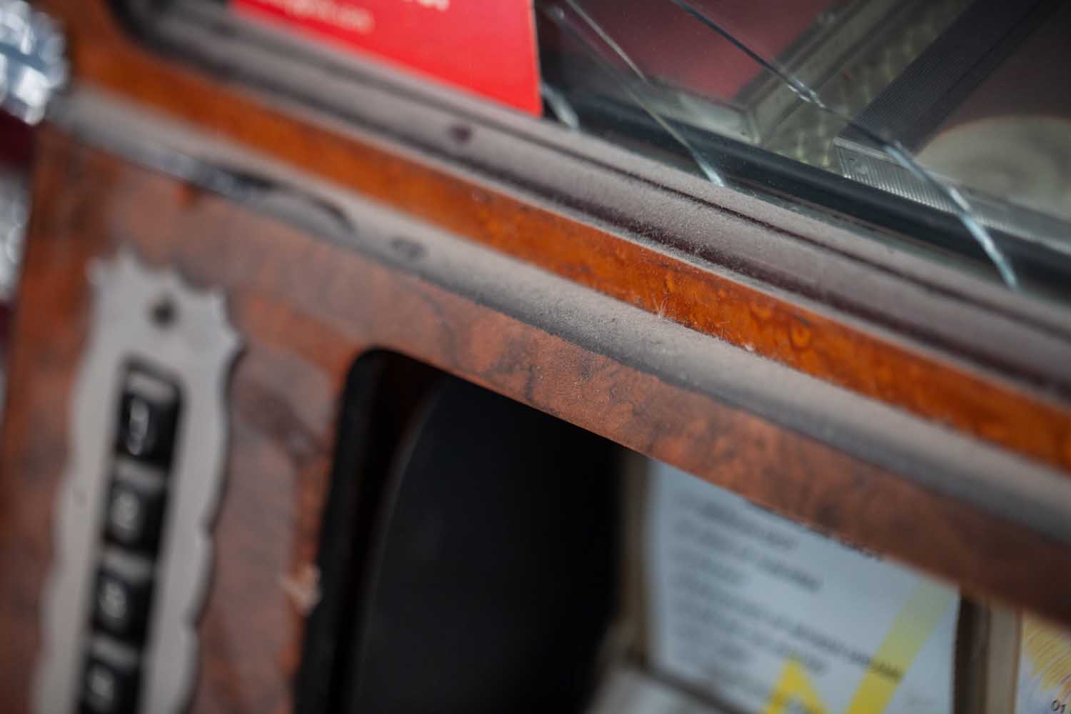 The jukebox cabinet had some pretty serious exterior damage which is to be expected after two decades use in bars and pubs, but was still strong and otherwise remained in great shape. Sound Leisure are the only company in the world still making one piece jukebox cabinets and have always done this with our Classic Jukeboxes. When we get an old machine like this back and you see how well the cabinets have retained their shape and strength over many years it does reinforce the ongoing commitment to retaining this feature of our jukeboxes. There were a multitude of scratches, chips and war wounds on the exterior of the cabinet and it was very dusty and grimy. The dents in the cabinet dome and front hoop are made by thousands of hands, rings, watches and pieces of jewellery hitting the jukebox over countless years as customers make their selections, each leaving their imprint.
