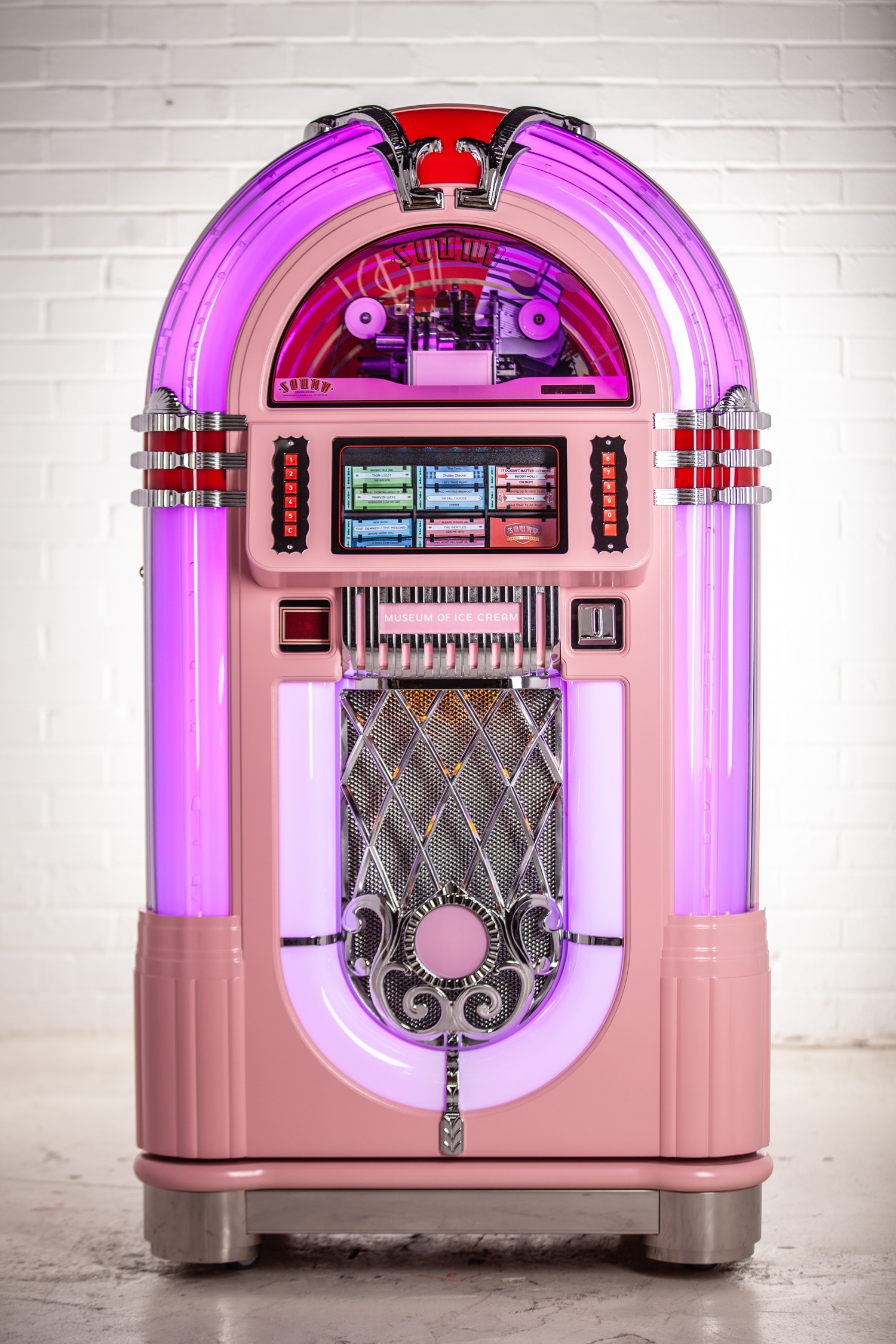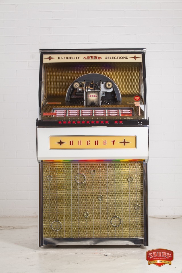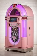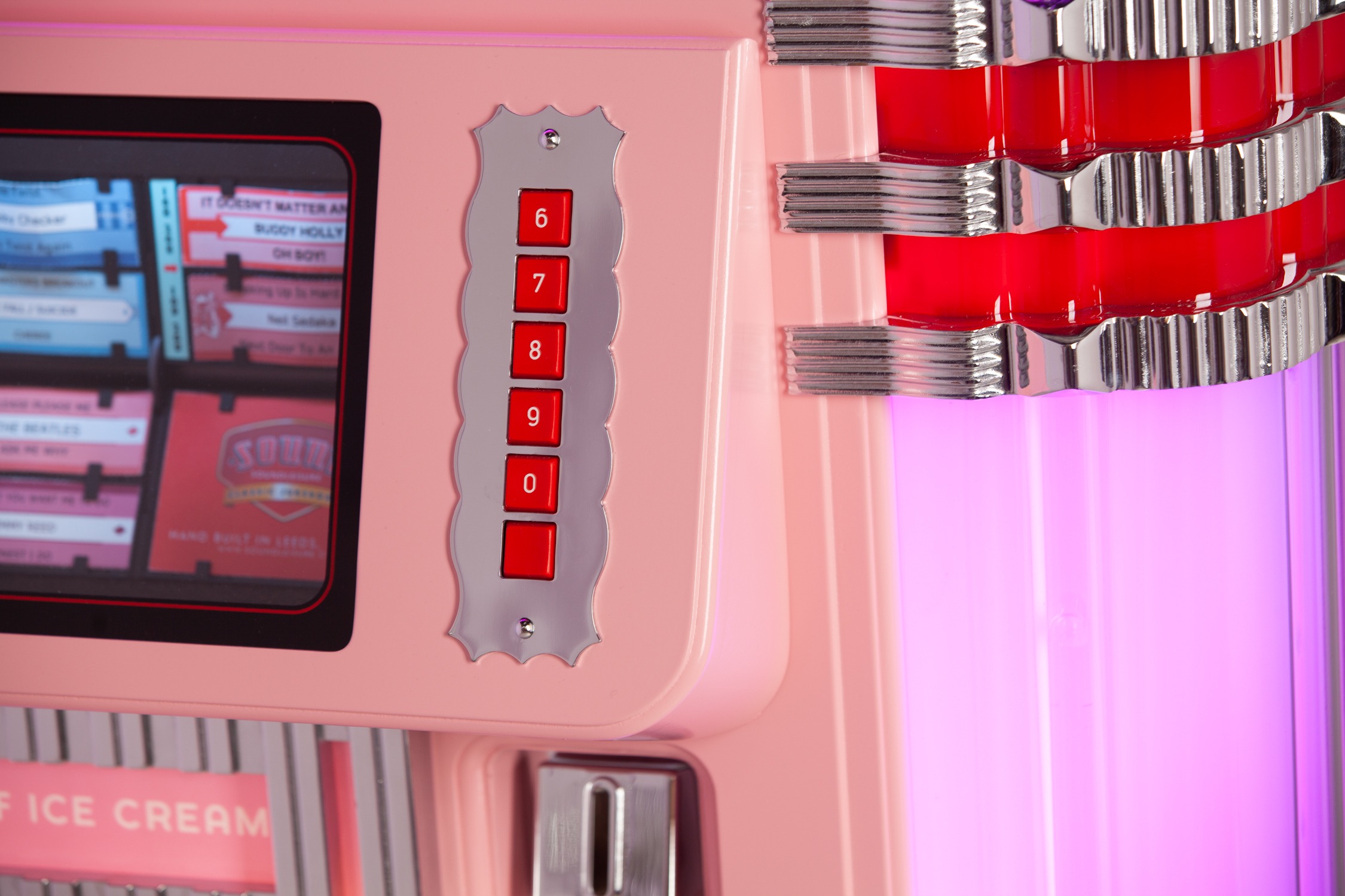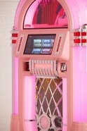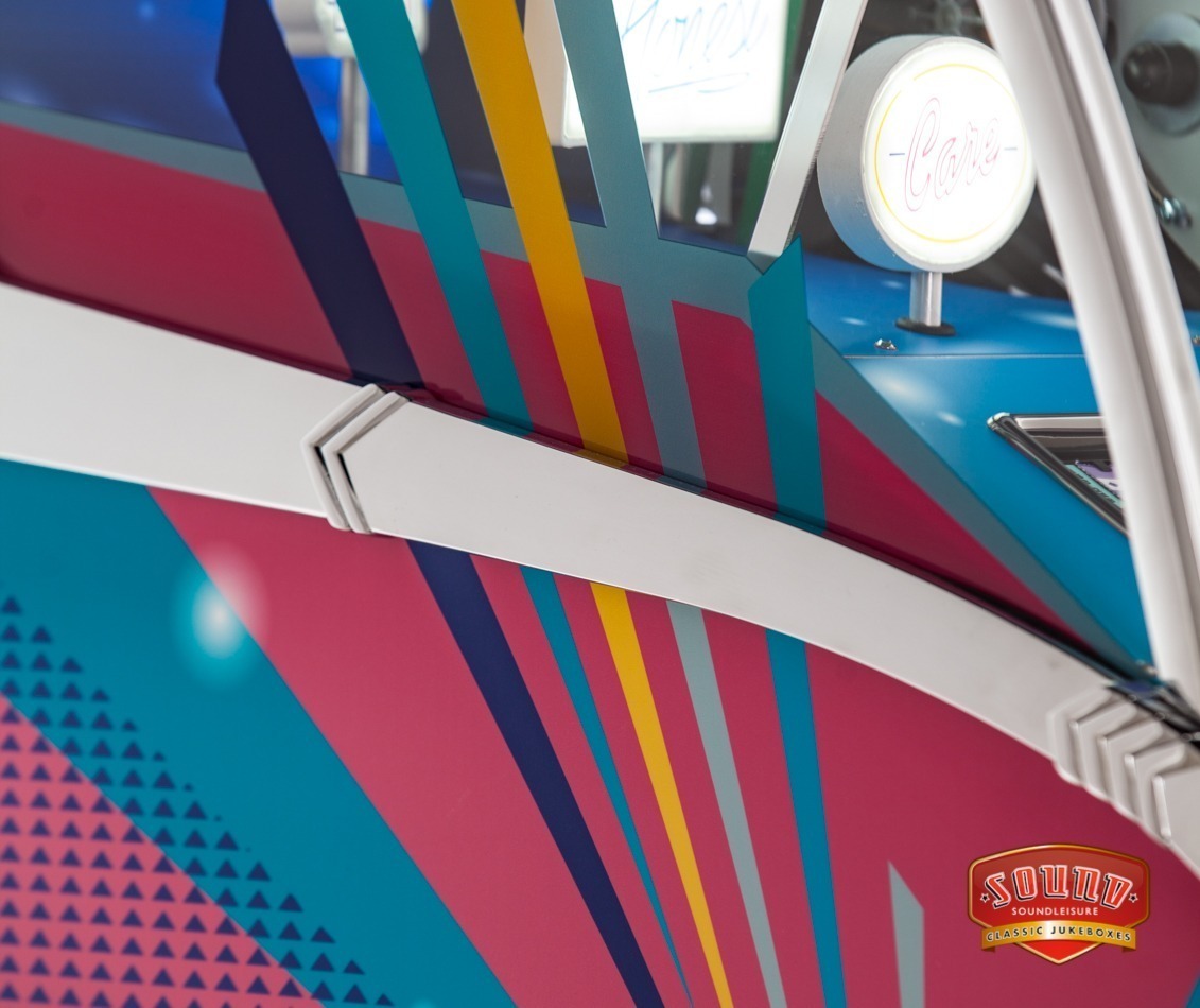 Each product page only shows options which are relevant to the jukebox model you are looking at, so different products will show different options. Each ‘Custom Shop’ option is identified using a graphic, showing the relevant jukebox (in black and white) and the custom component in pink. Here’s a few ‘Custom Shop’ examples from our popular Rocket and 1015 models: These are just a few examples of where customisation can occur on a jukebox: