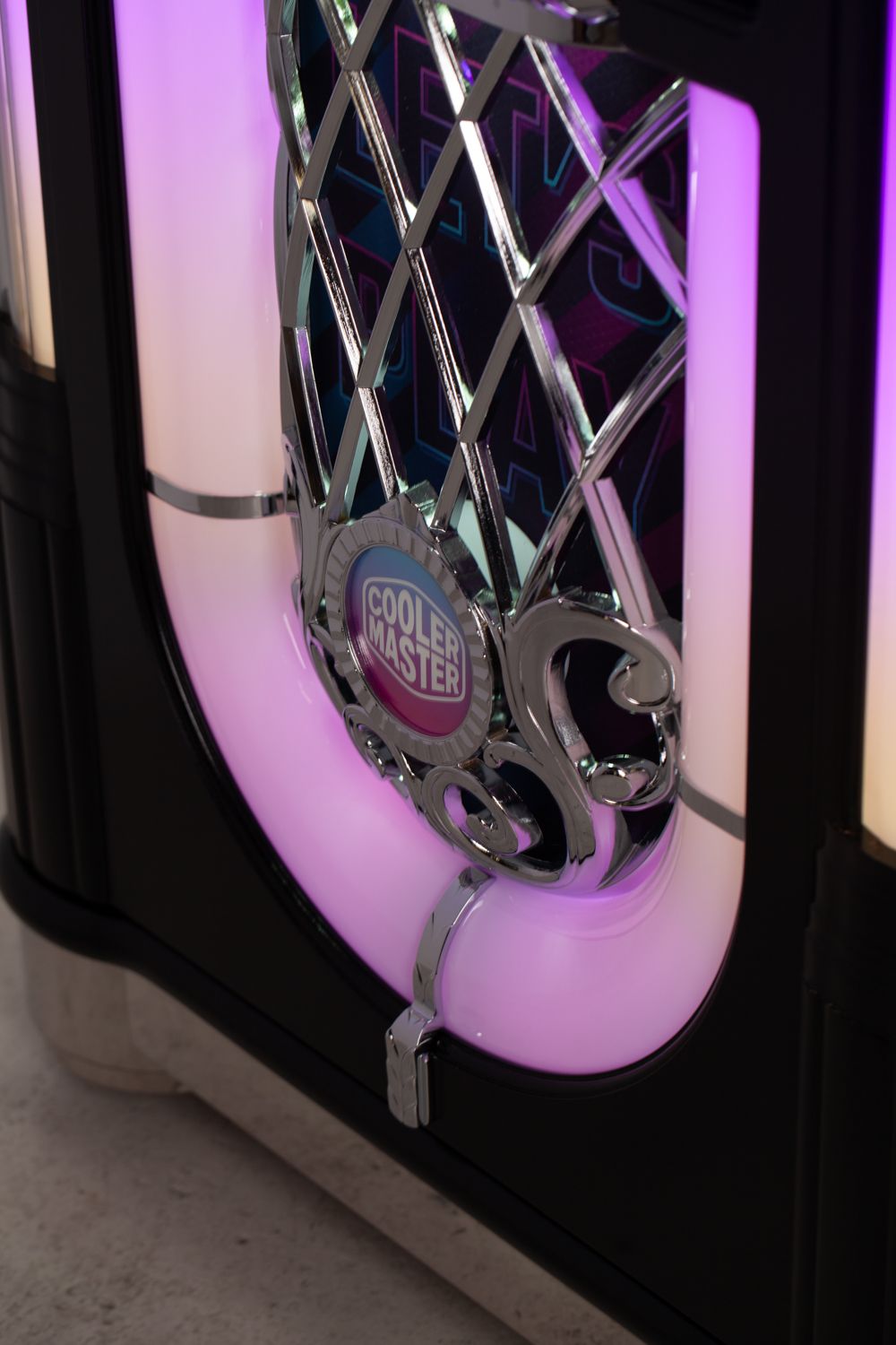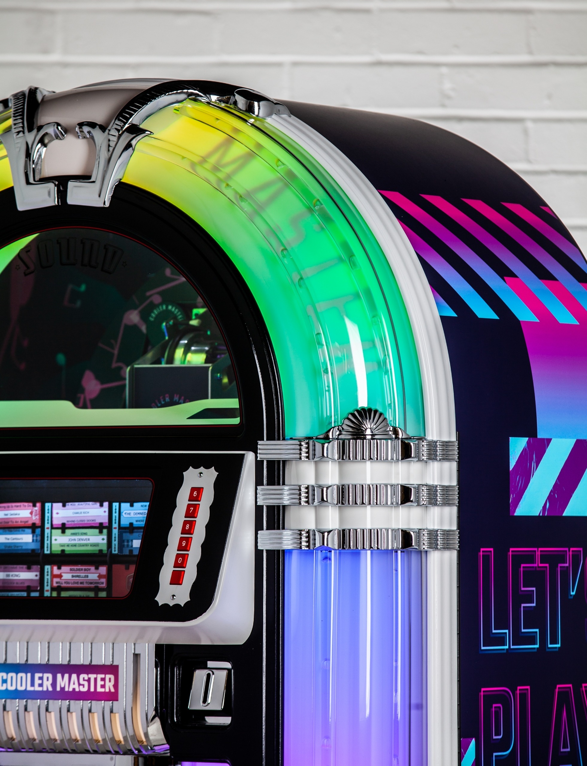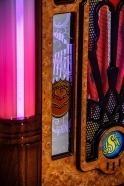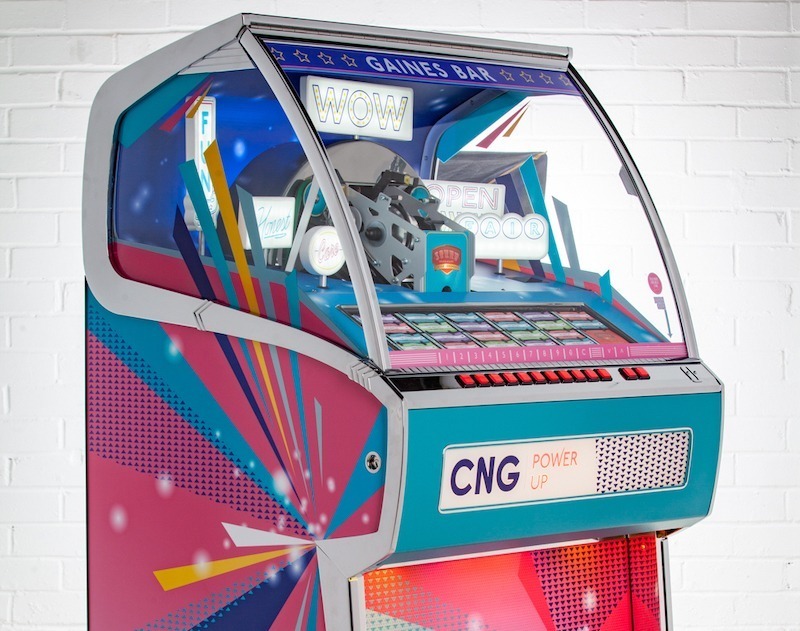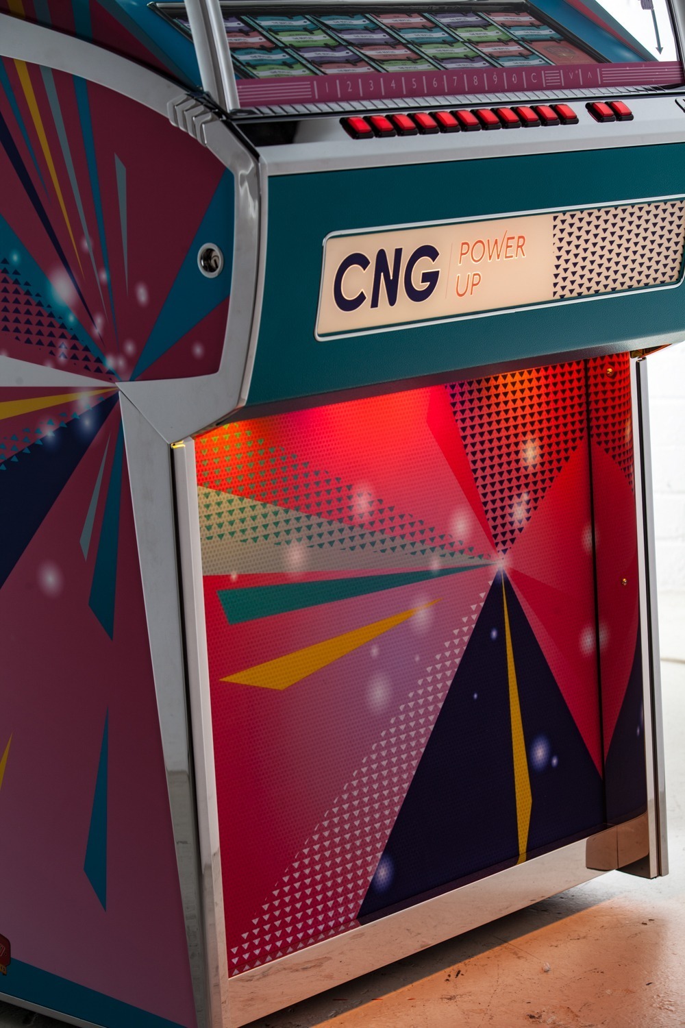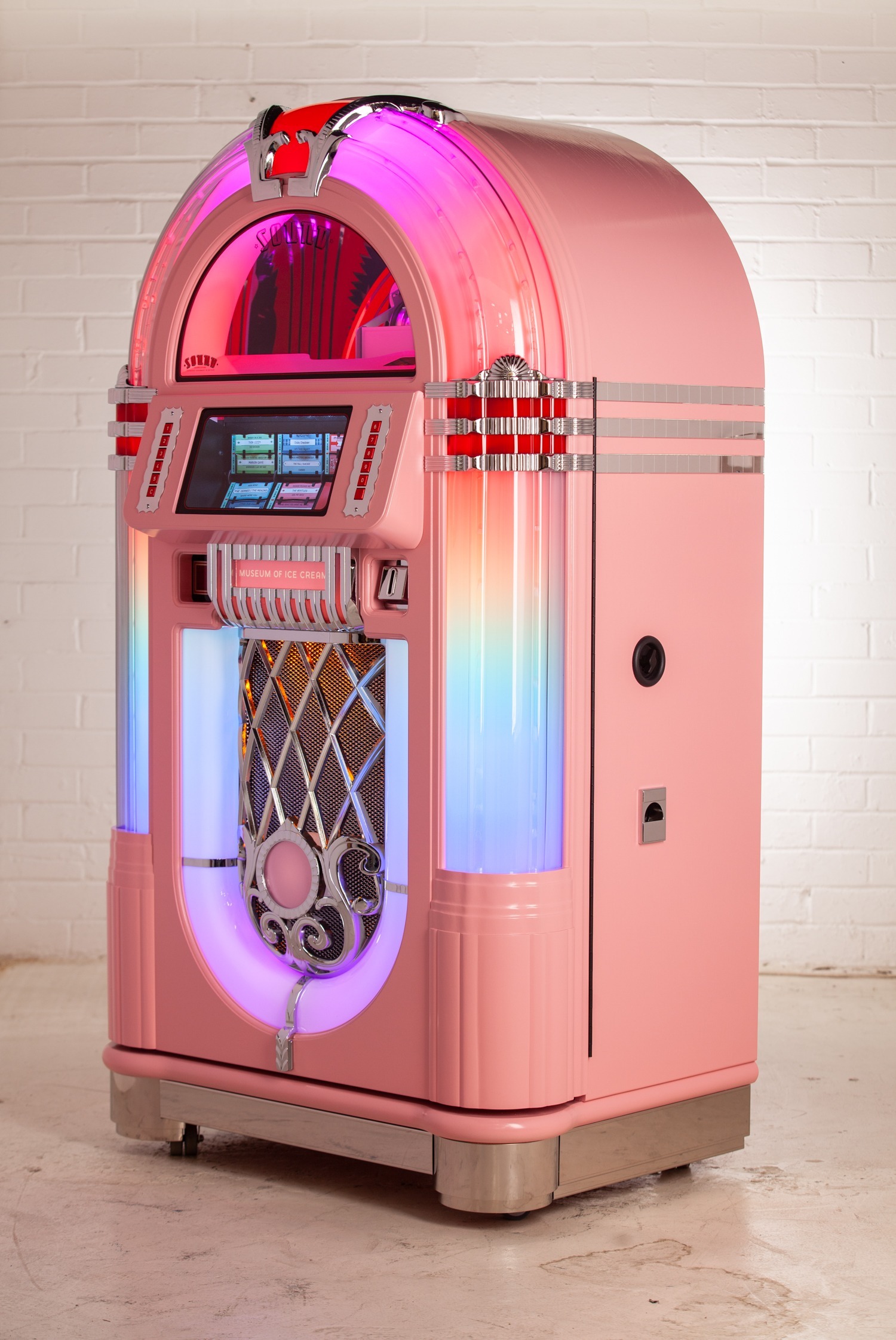 Each product page only shows options which are relevant to the jukebox model you are looking at, so different products will show different options. Each ‘Custom Shop’ option is identified using a graphic, showing the relevant jukebox (in black and white) and the custom component in pink. Here’s a few ‘Custom Shop’ examples from our popular Rocket and 1015 models: These are just a few examples of where customisation can occur on a jukebox: