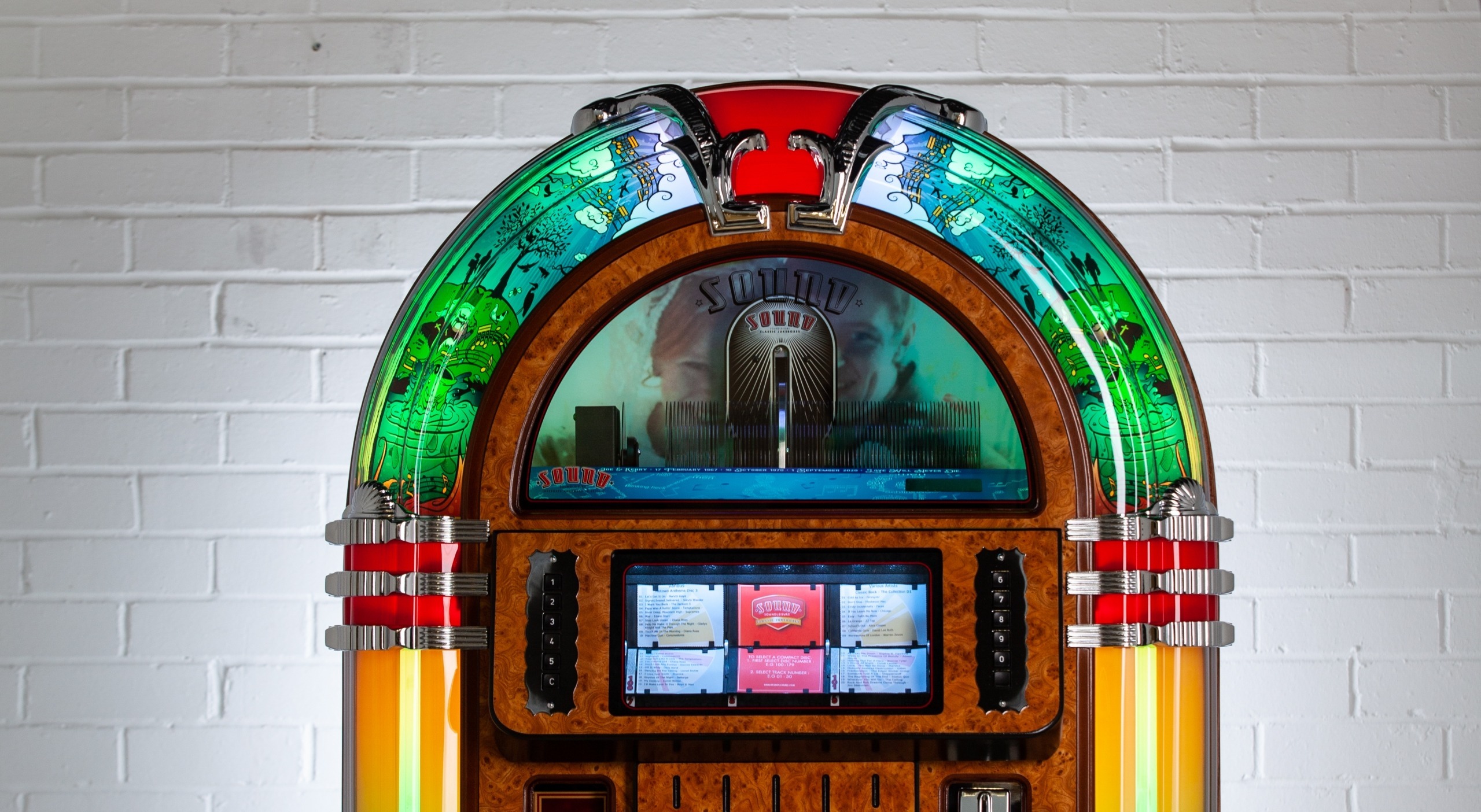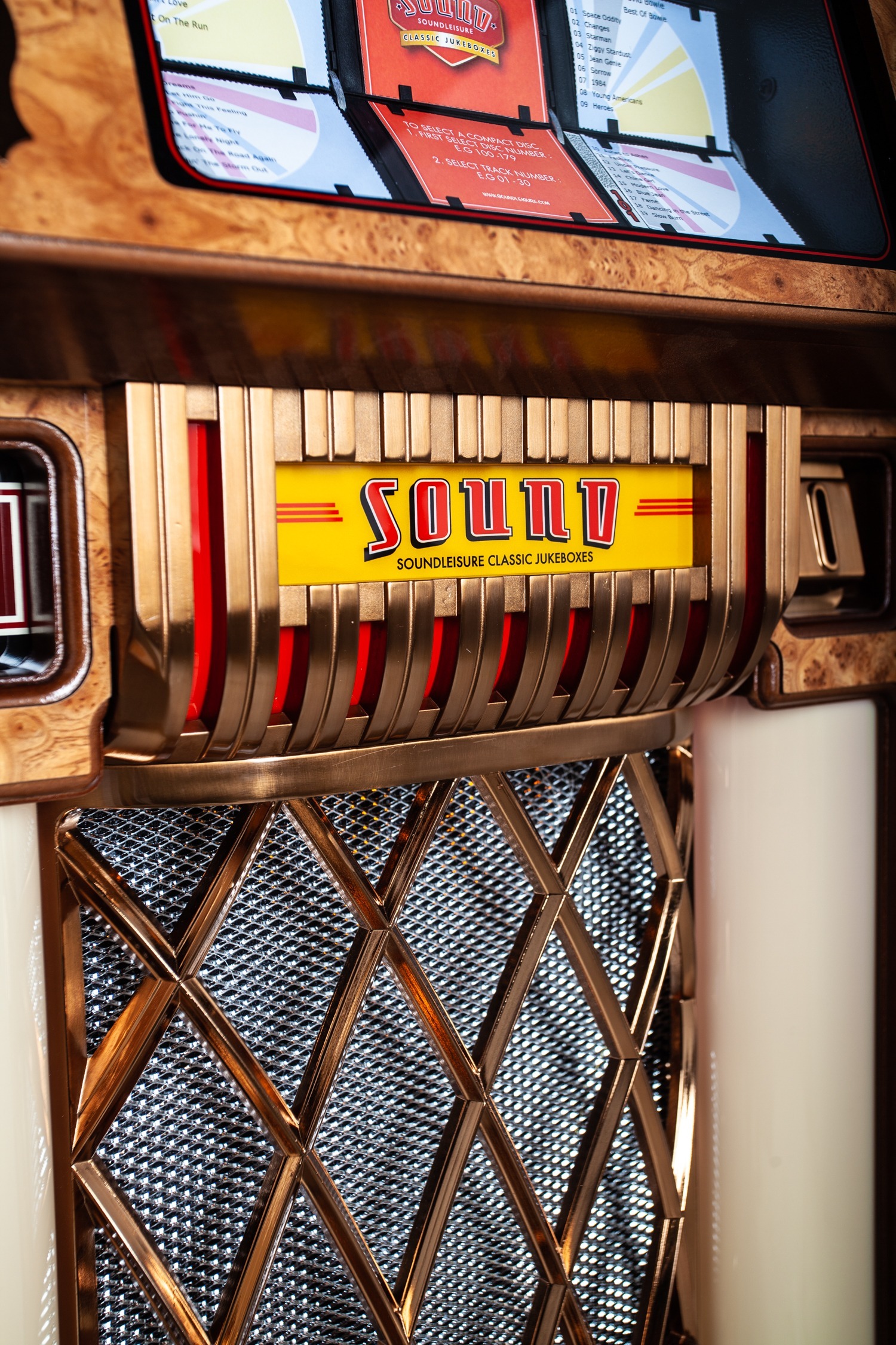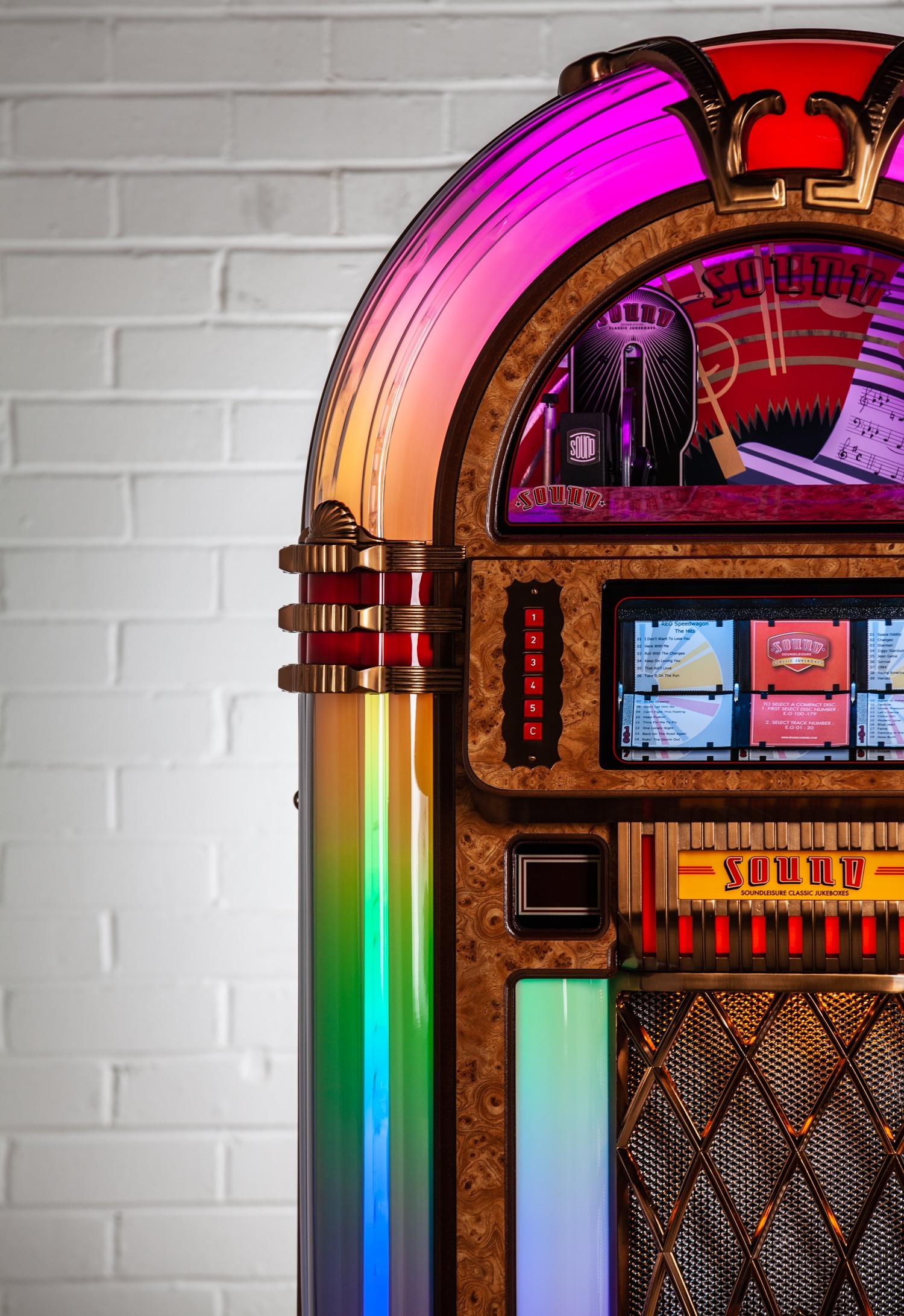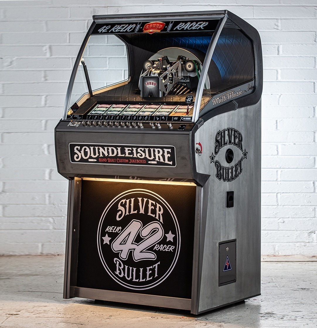 We can customise most aspects of a jukebox, but to make things easier for our clients we’ve included ‘Custom Shop’ options for the most common customisations on all our jukeboxes product pages. To view these, just select ‘Configure & Buy’ on any jukebox product page. You can then select: