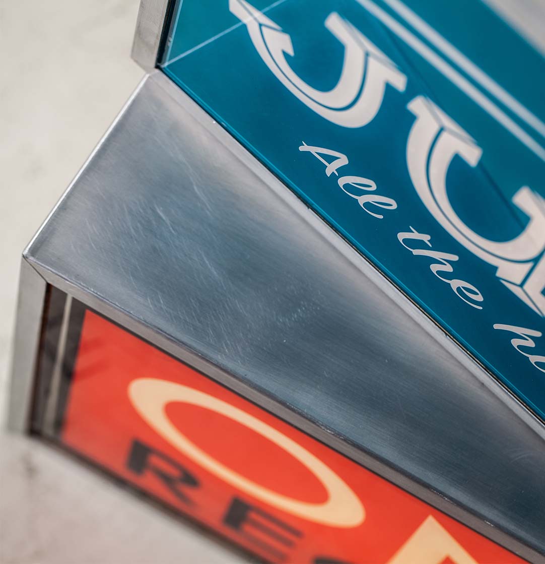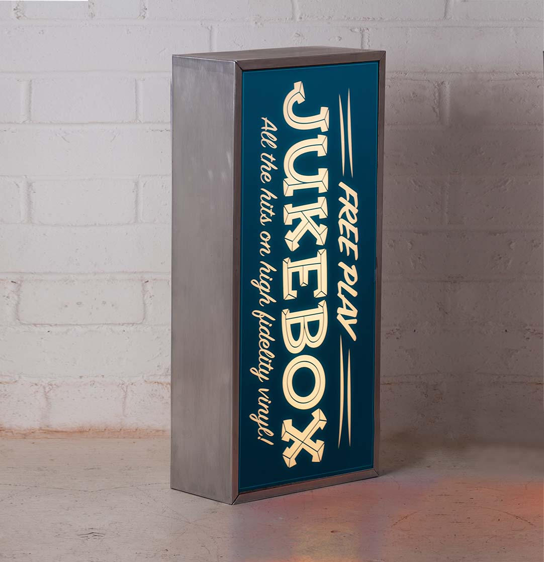 Each LiteSign is created from offcuts left over from the production of our amazing range of classic jukeboxes. The waste wood is re-machined and upcylced to produce the cabinets for these eyecatching home accessories, which are then hand wrapped in an uncoated, brushed aluminium skin. This gives each sign a unique and characterful patina that will continue to age and develop over time.