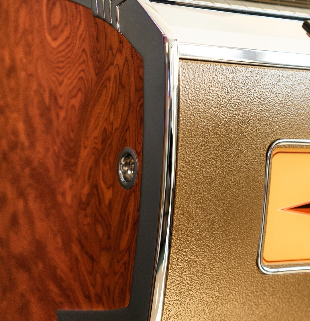 Stunning Vinyl Rocket jukebox with cabinet sides finished in a custom walnut burr veneer. This is a very special custom cabinet.