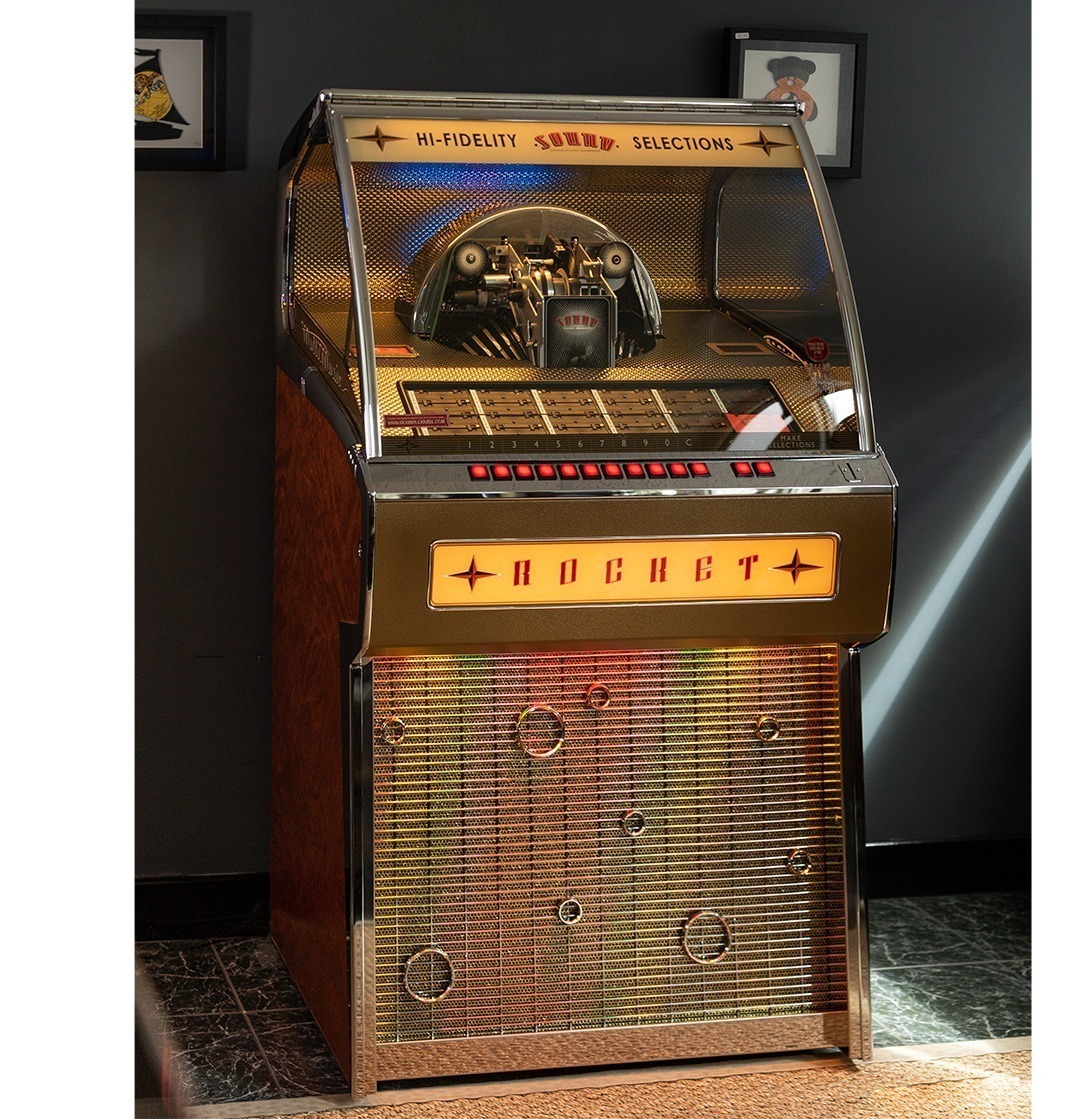 This stunning 50s styled jukebox takes its name from the song, ‘Rocket 88’ by Jackie Brenston and the Delta Cats. The 1951 song has been hailed as the first true ‘rock & roll’ record and our Rocket jukebox certainly has the sound and looks to live up to the notoriety. Featuring graceful, sweeping cabinet chrome-work and a combination of shaped glass and subtle lighting, the Rocket jukebox draws attention but retains an air of elegance ensuring it look amazing in any location. Finished as standard in natural, warm medium oak.