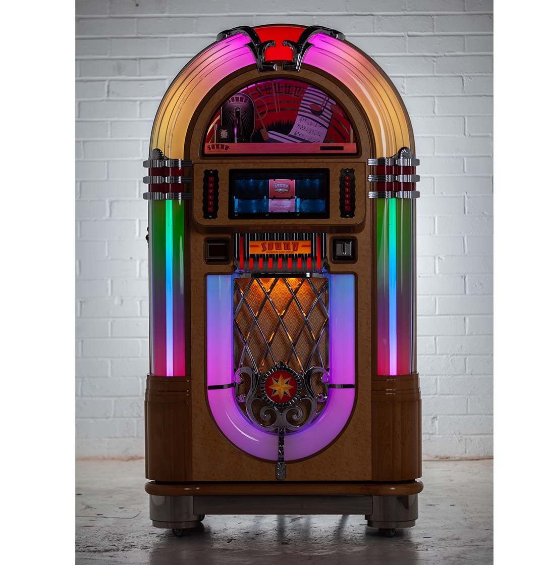 The styling of this classic model pays homage to the iconic Wurlitzer 1015 Jukebox originally manufactured in the mid-1940s. A hand-formed one piece wooden cabinet, champagne coloured bubble tubes, aluminium chrome plated side castings and speaker grill adorn each machine. The low energy LED Diamond Pack lighting (included as standard) brings the jukebox to life and enables you to set your favourite colour combination from 10 pre-set patterns and adjust the brightness to suit your environment. Music is selected via the button bank on the jukebox or via the infrared remote control that also facilitates track playback control, source selection, volume, shuffle play options and cabinet lighting control.