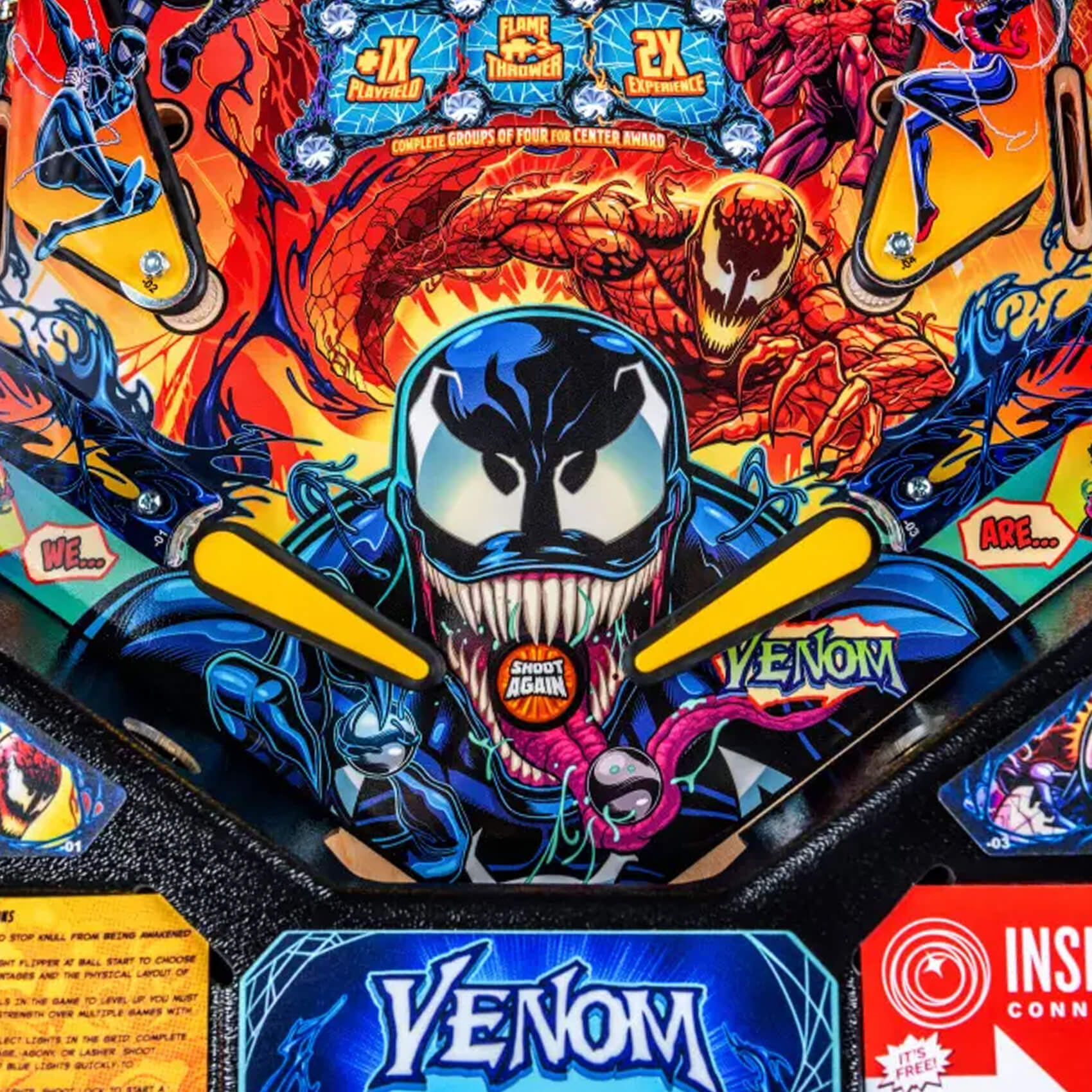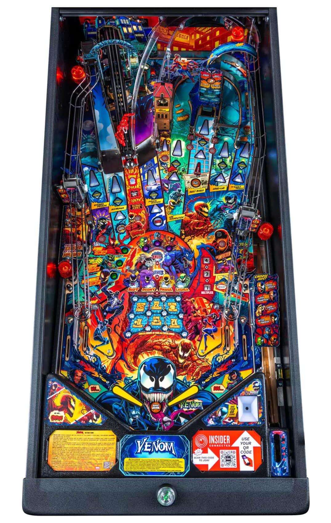 Venom pinball games include Stern’s award-winning Insider Connected™ system, which enables players to interact with the game and a global network of players in a variety of ways. Through Insider Connected, players will be able to save their game progress through connectivity persistence, allowing anyone to become a (anti)hero as you advance through the game to reach the final wizard mode at the end, no matter how many tries it might take.
