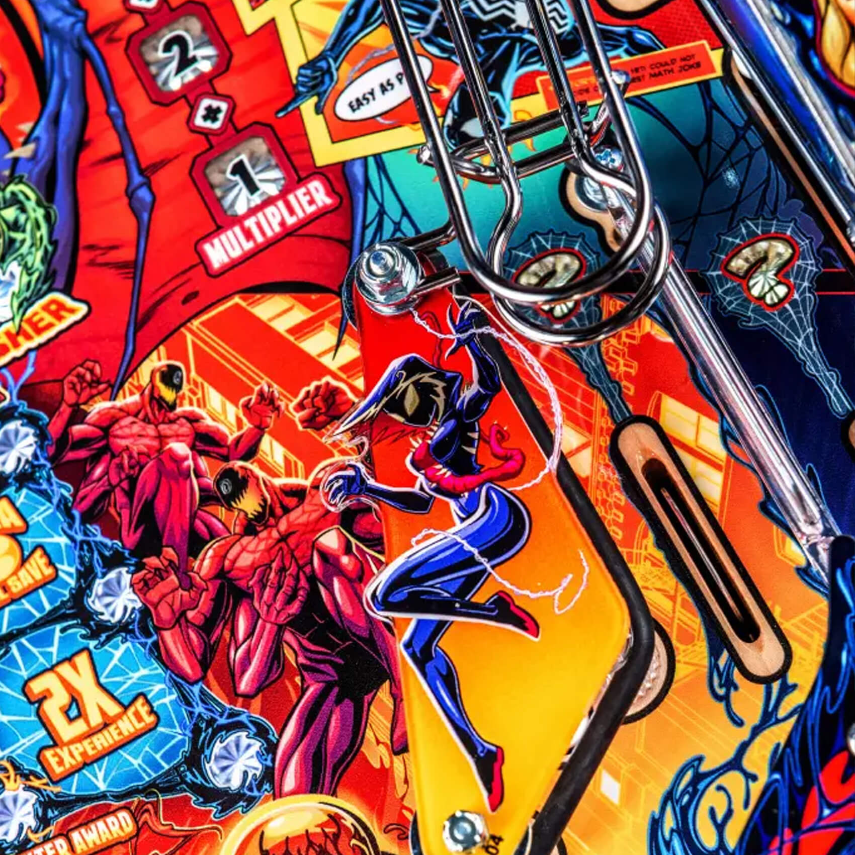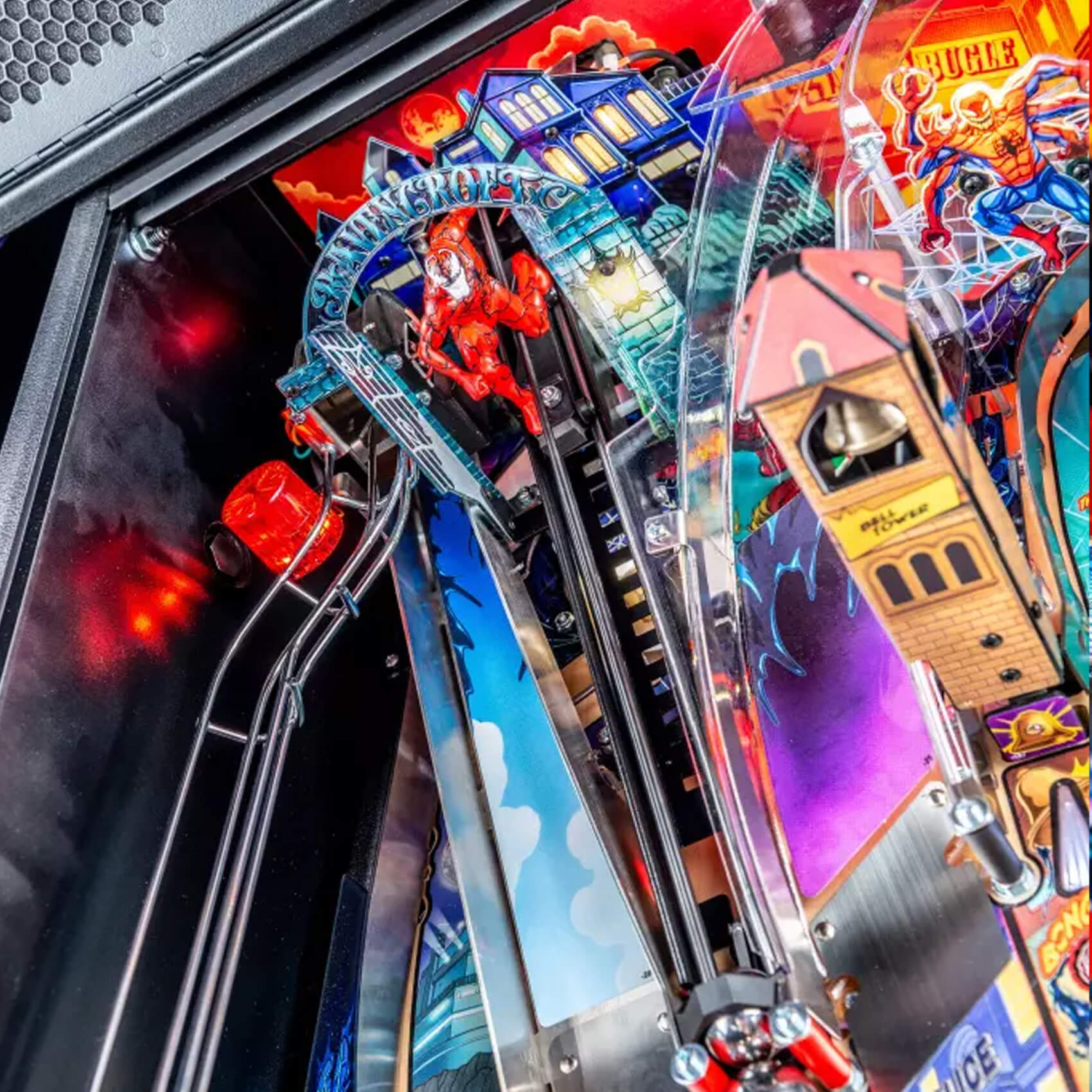 Playing as Venom, gamers will select a host to bond with at the start of each game, altering the entire gaming experience both physically and digitally. Vertical pinball lock symbiote containment vessels located on both sides of the playfield lock and quickly release balls for constant frenetic action as players explore shots through the mechanically changing Agro-Lab and Life Foundation pathways. Players will bash an interactive, custom sculpted Carnage captive ball back into Ravencroft Institute for the Criminally Insane. Additionally, a surprise Doppelganger attack can swing into action at a moment’s notice, unveiling three uplift targets wreaking chaos.