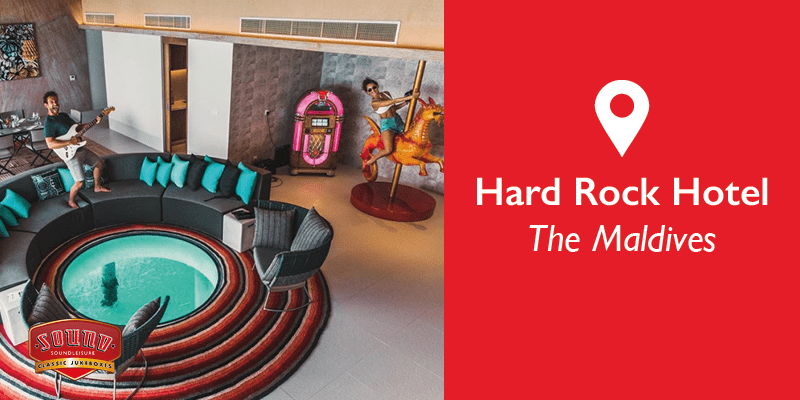 In the Maldives, the Rock Star Villa at the Hard Rock Hotel is meant to be enjoyed. It features a private dock, tuk-tuk bar, seahorse carousel, and an SL15 CD jukebox in the living room.